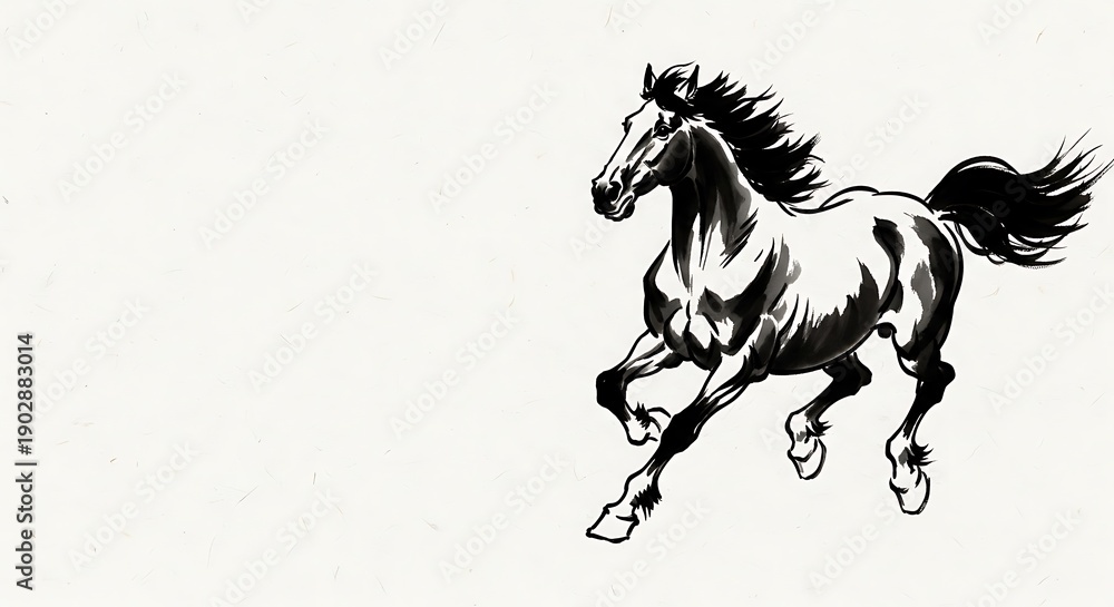 Konie - Black and white illustration of a galloping horse in motion #1902883014