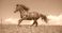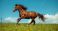 • Joyful bay horse galloping energetically on soft green summer grass field full length