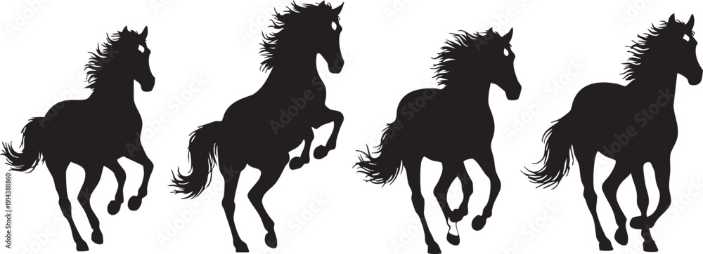 • Four black horse silhouettes running on white background horses 2