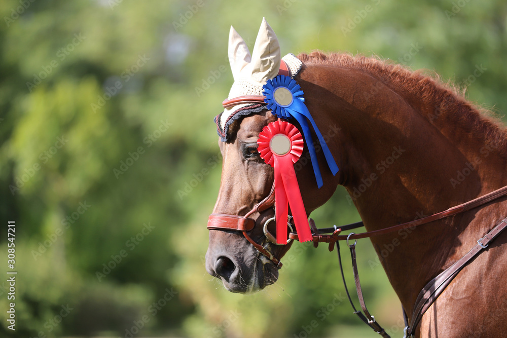 Konie - Beautiful purebred show jumper horse canter on the race course after race #308547211