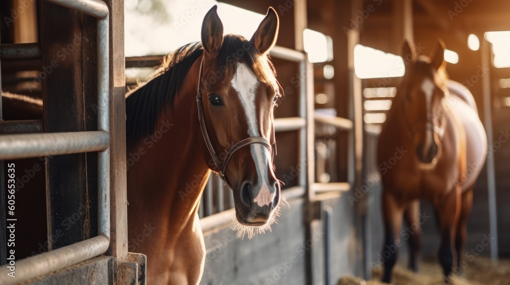 Konie - two brown horse in the stable, ai generative #605653635
