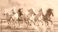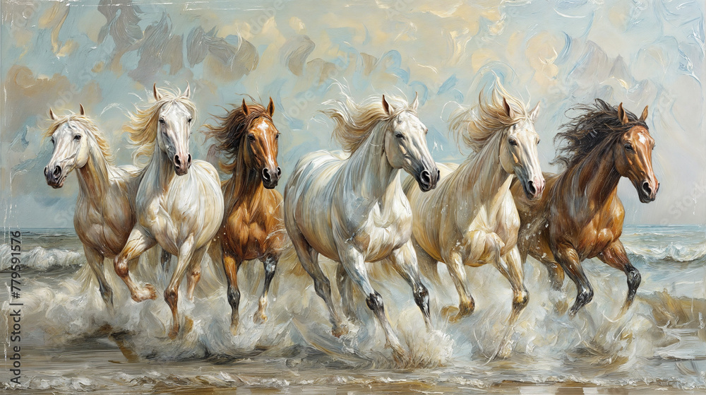 Konie - Painting of horse running on the beach, water splashing #779591576