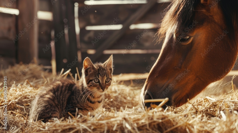 Konie - Playful Encounter Between Horse and Cat in a Hay Field #909033981