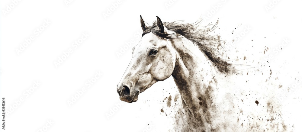 Konie - Sepia watercolor illustration of a dapple grey horse Elegant hand drawn artwork on a white... #933452614