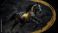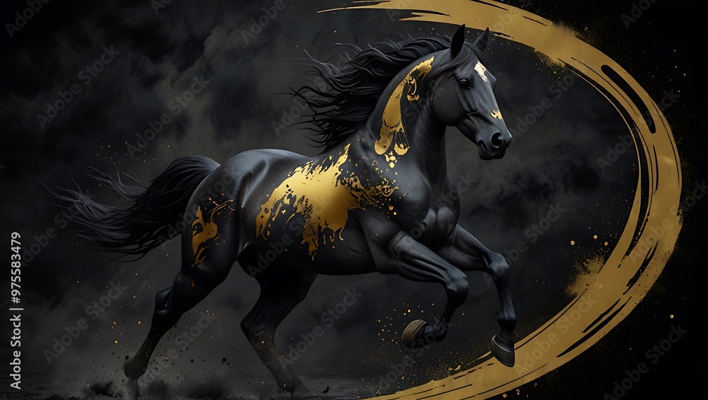 Konie - A black horse with gold accents gallops across a dark background #975583479
