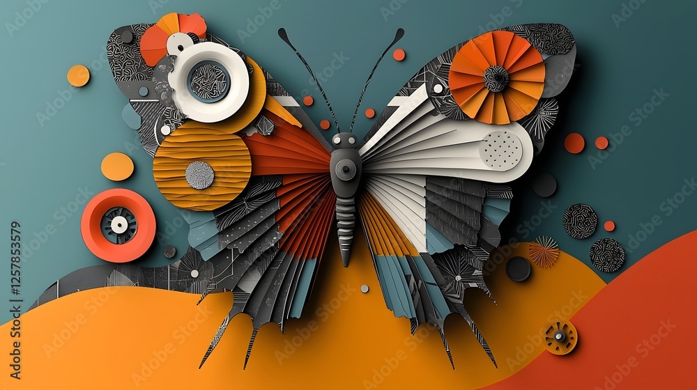 • Vibrant Layered Paper Cut Butterfly Wings Abstract Artwork with Multicolored Geometric Patterns and Shapes in a Modern Digital Style