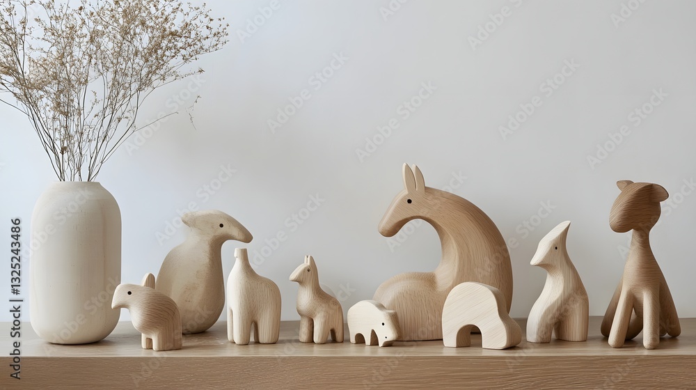 • Handmade wooden animal toys in a minimalist eco-friendly playroom