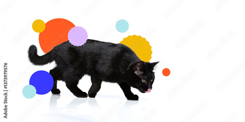 • Conceptual design. Black cat walking across glossy floor with tongue out, framed by colorful circular elements. Concept of pets care, veterinary, domestic animals, grooming services.