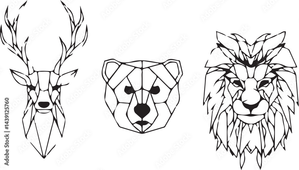 Zwierzęta geometria - Vector black silhouette of a tribal wolf, lion, and tiger head, a wild animal tattoo mascot... #1439125760
