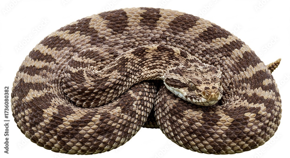 • とぐろを巻いた茶色のヘビ鮮明な光の下で特徴的な幾何学模様がはっきりと浮かび上がる. AI Generated