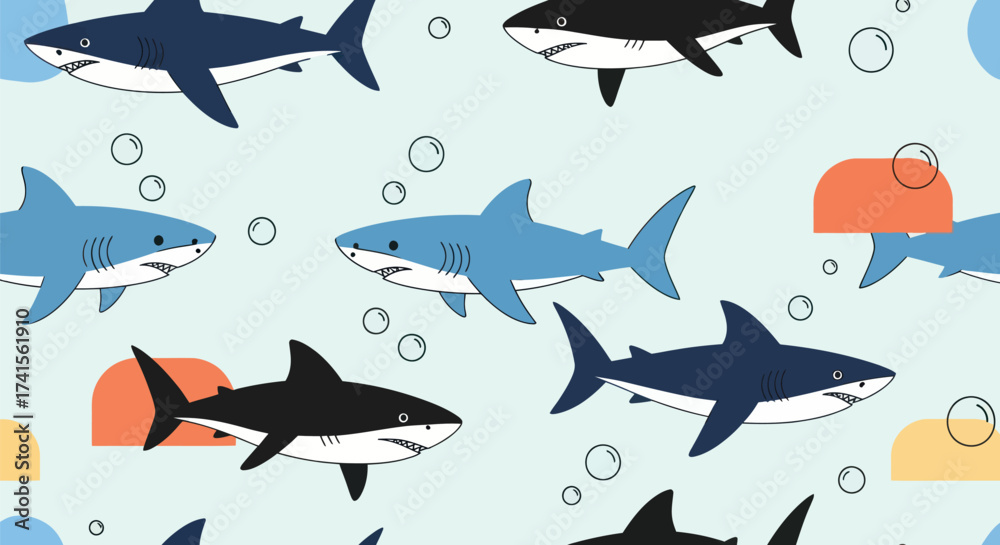 Zwierzęta geometria - Sharks swim in repeating pattern with bubbles and semi-circular shapes #1741561910