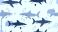• Sharks swim in repeating pattern with bubbles and semi-circular shapes