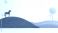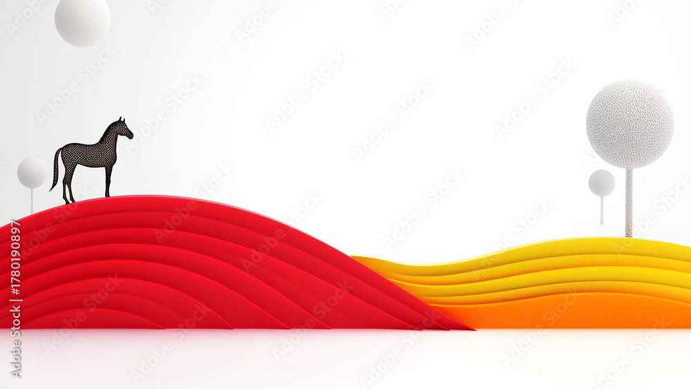 カラフルな丘の上に立つ一頭の馬、抽象的な3D風景