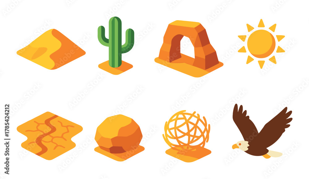 • Vibrant desert icons: pyramid, cactus, arch, sun, eagle, tumbleweed, rock, cracks