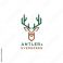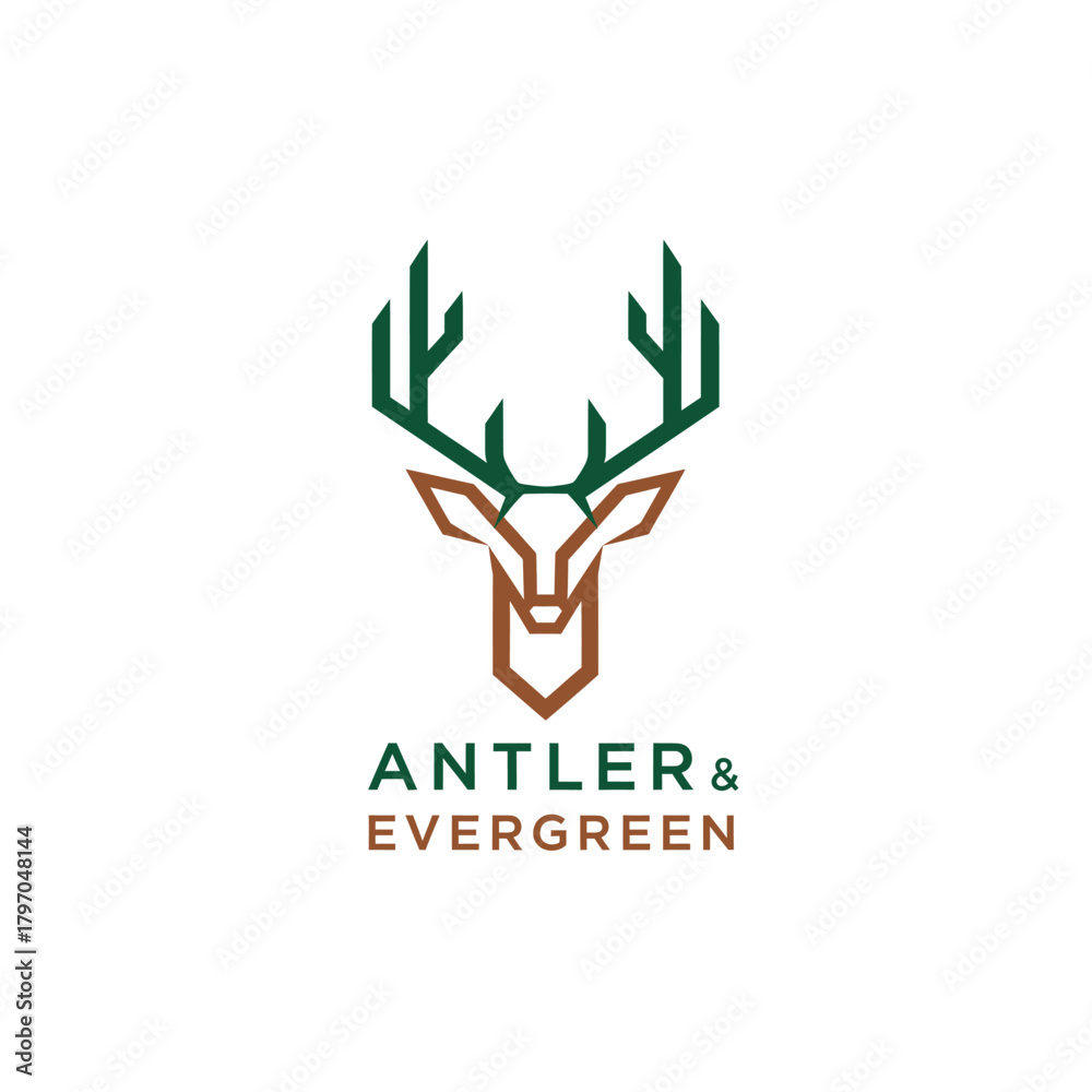 Zwierzęta geometria - A geometric deer head logo with antlers in green and brown, with text "ANTLER & EVERGREEN" below #1797048144