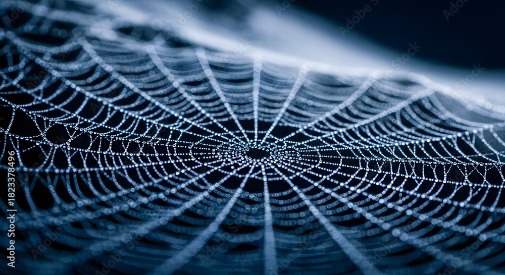 Zwierzęta geometria - Extreme close up of spider web strands covered in morning dew drops with blue color filter #1823378496