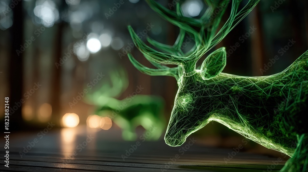 Zwierzęta geometria - Two neon green deer crafted from wireframe geometry at the forest's edge represent the blend of... #1823882148