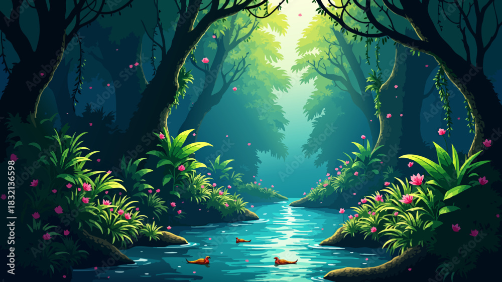 Zwierzęta geometria - Detailed Anime Tropical Jungle Riverbank Vector Background #1832136598