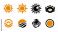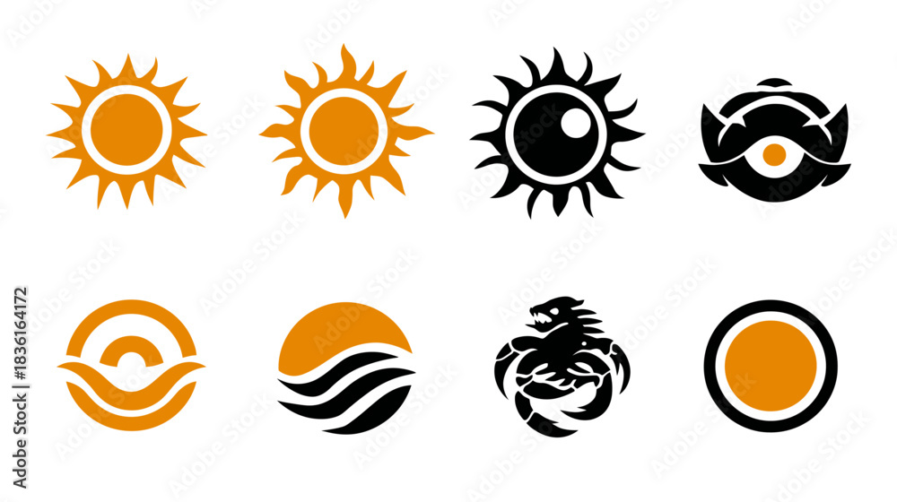 • Abstract orange and black graphic symbols set: Sun, waves, geometric, and mythical creature design elements