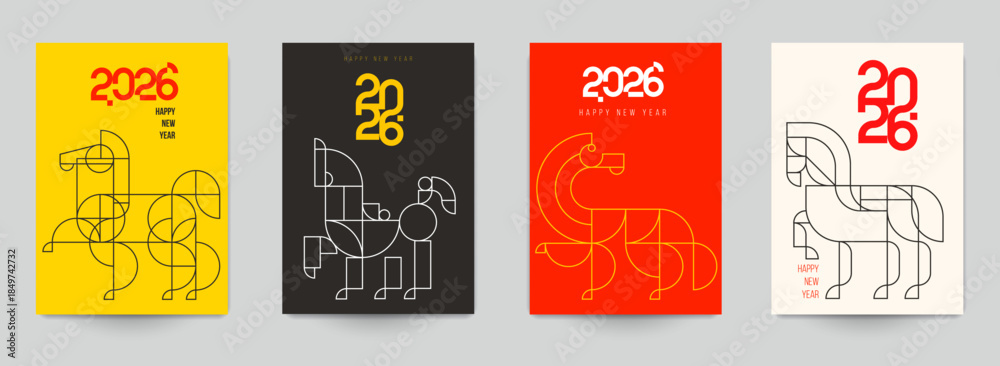 • Modern template design with silhouette horse in fashion minimalist style. Chinese new year 2026. Set holiday background for cover, invitation, poster, banner, flyer, placard. Vector illustration.
