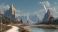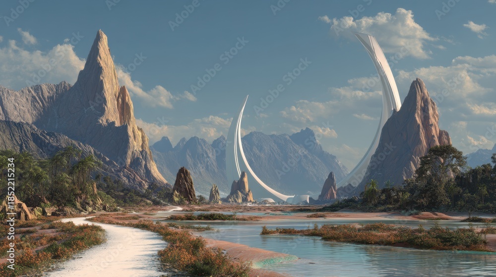 Zwierzęta geometria - Large curved structures stand tall beside a river flowing through a mountain landscape. Hills... #1852215234