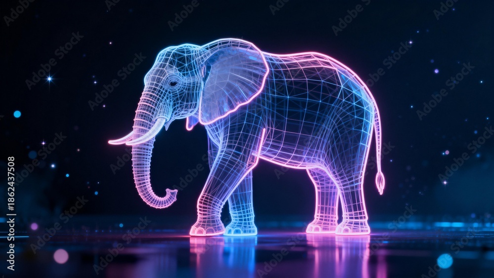 Zwierzęta geometria - Wireframe elephant in neon glow #1862437508
