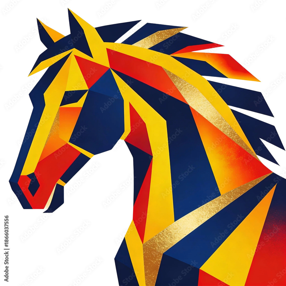 • Geometric horse head illustration in bold blue, red, and gold colors. Abstract polygonal animal artwork isolated on transparent background for logos, branding, posters, and modern design projects.