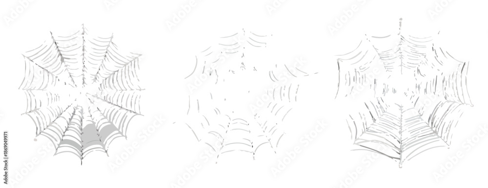 • Set di tre ragnatele trasparenti e delicate, perfette come illustrazioni vettoriali per design a tema natura o Halloween.