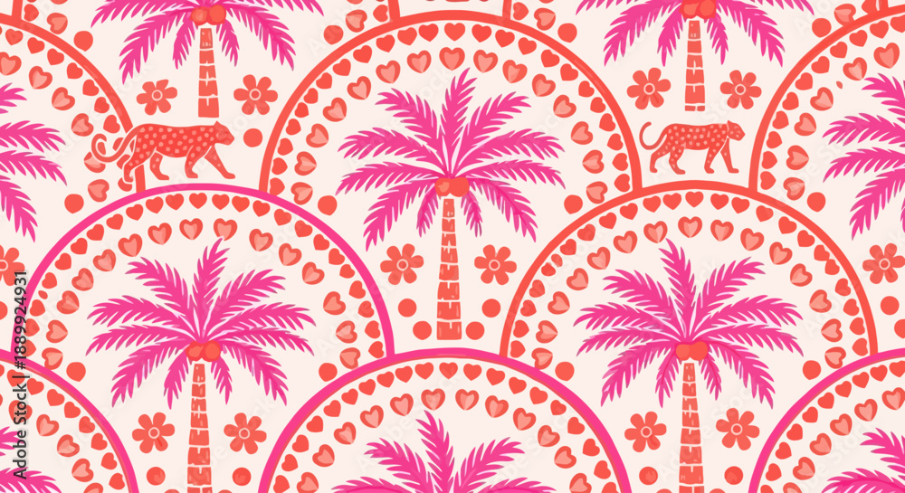 • Vibrant Tropical Pattern Featuring Palm Trees and Animals in a Repeating Design