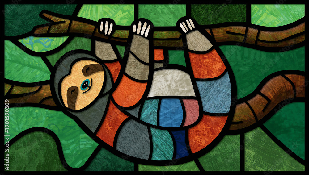 • 雨林エメラルド背景でステンドグラス風ナマケモノが枝にぶら下がる