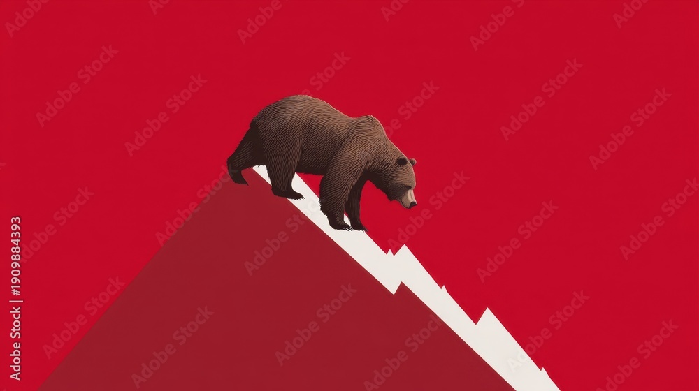 Zwierzęta geometria - Brown bear descending a stylized red mountain with zigzag path #1909884393