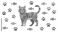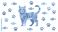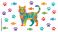 • Colorful geometric cat surrounded by cute fish and paw prints, abstract polygon animal vector illustration