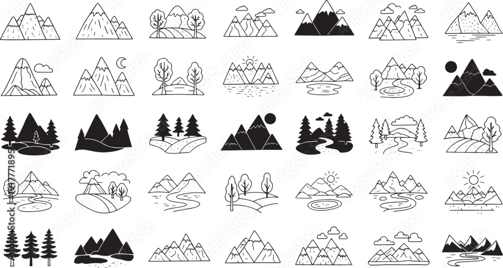 • Viewing a curated collection of minimalist black-and-white nature illustrations arranged in a six-by-six grid of mountain and tree icons