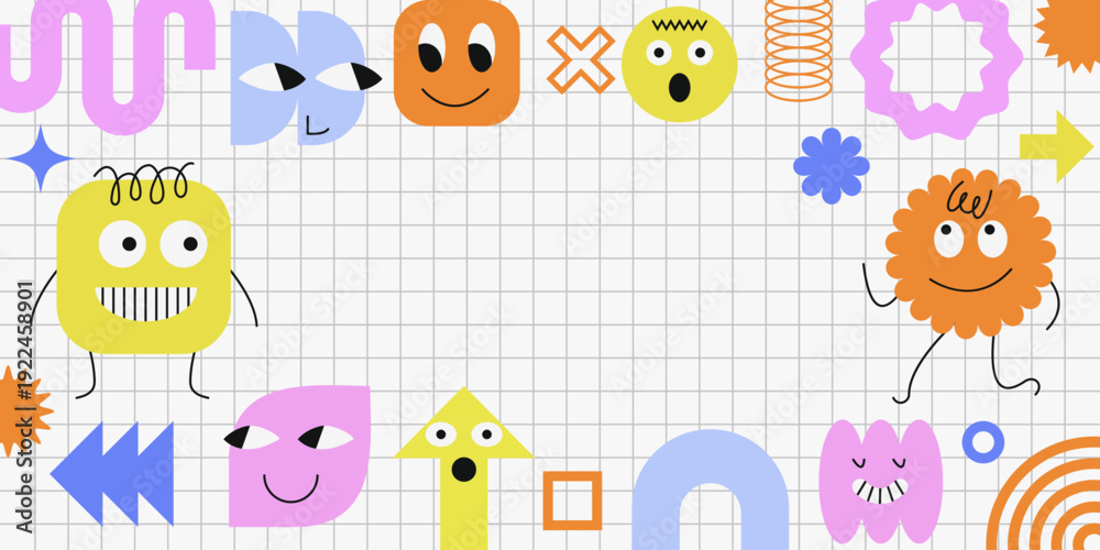 • Cute vector social template with abstract face characters and empty cloud text frame. Bright playful design ideal for kids content, quotes, stickers, posters, school projects and social media graphics