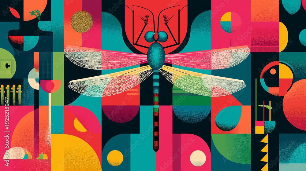 • Colorful abstract dragonfly illustration in vibrant shapes and patterns