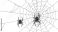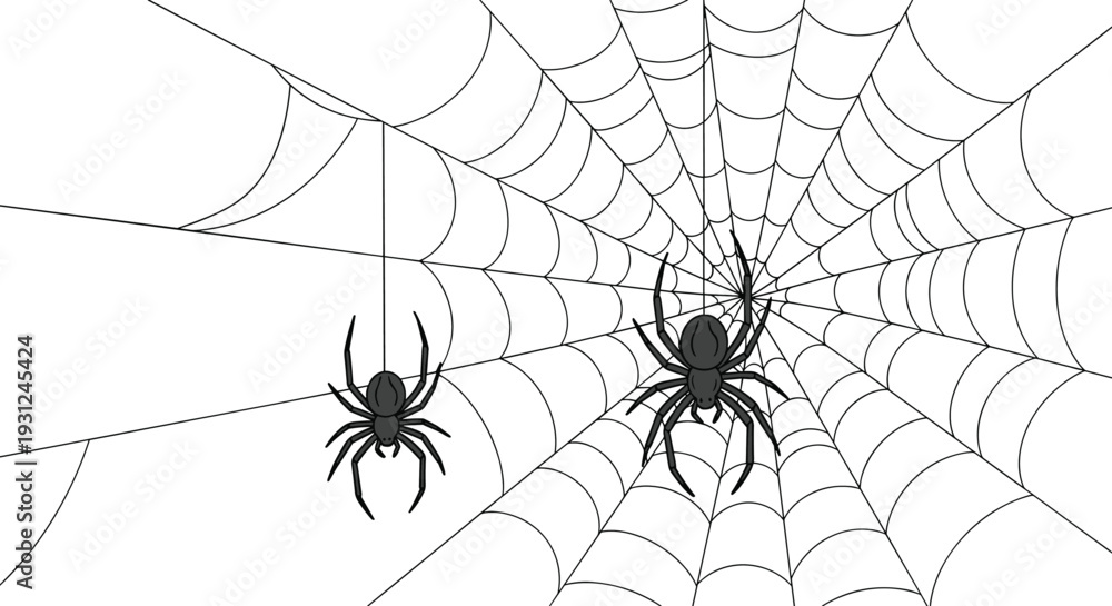 Zwierzęta geometria - Two black spiders hang from thin silk threads on their intricate webs against a plain white... #1931245424