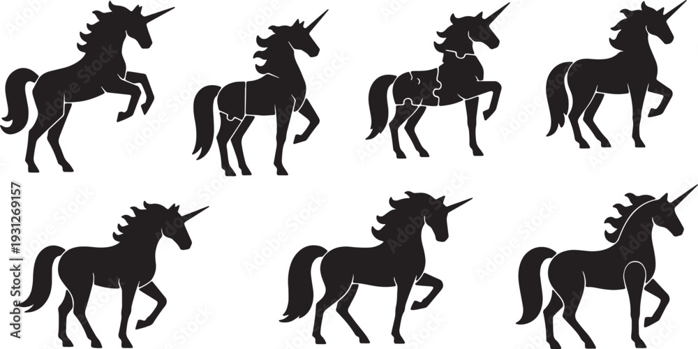 • Black Solid Abstract Geometric Unicorn Silhouettes Set of Six on White Background