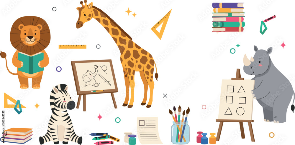 Zwierzęta geometria - lion giraffe zebra and rhino plus books art easel crayons and geometry tools Cute safari animal... #1943345757
