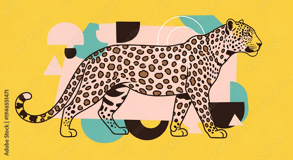 • ヒョウが幾何学模様の中で鮮やかに歩むイラスト