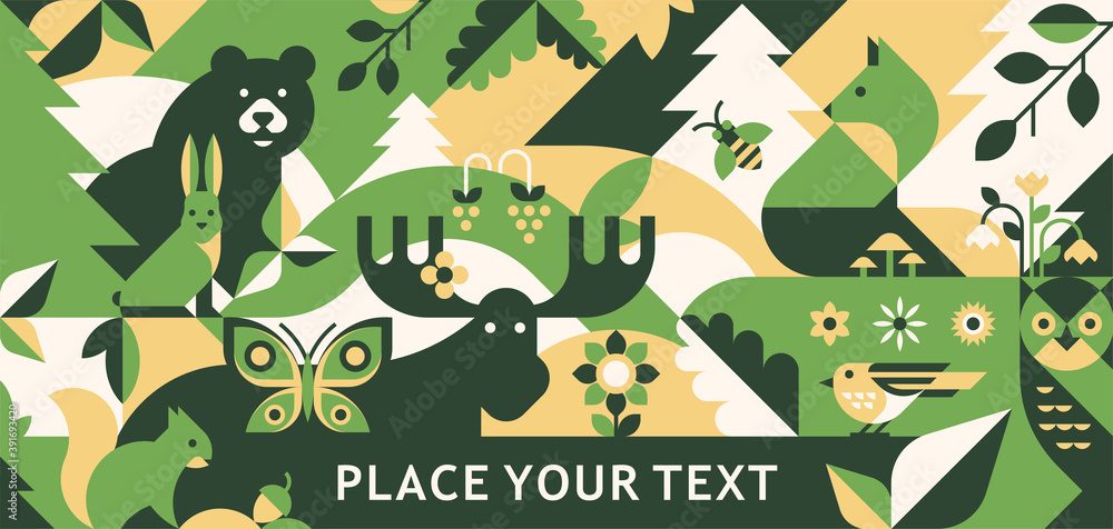 Zwierzęta geometria - Animal abstract vector background. Geometry forest pattern for forest day print, greeting card,... #391693420