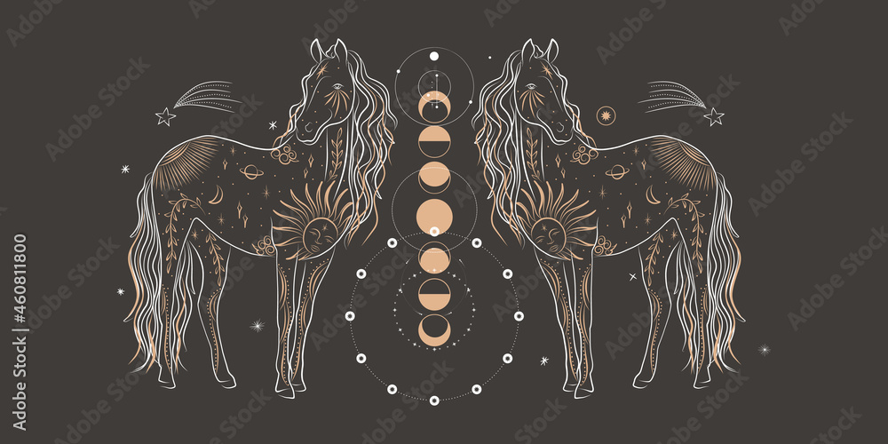 • abstract illustration of a silhouette of the animal of the wild world. sacred geometry and celestial space bodies. bogemical of the sun and moon