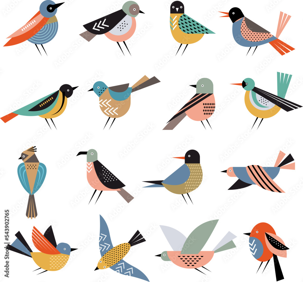 Zwierzęta geometria - Geometrical birds. Abstract stylized shapes of freedom flying bird in various action poses recent... #543902765
