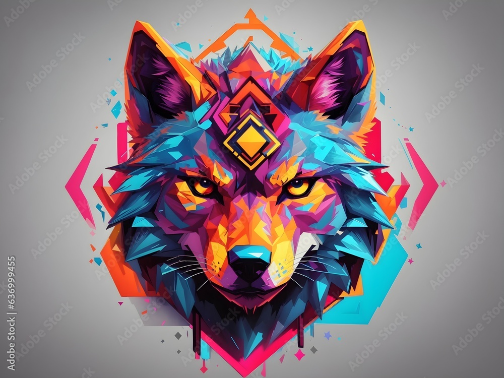 • Colorful wolf head on a background of geometric shapes. Vector illustration. Ai generative