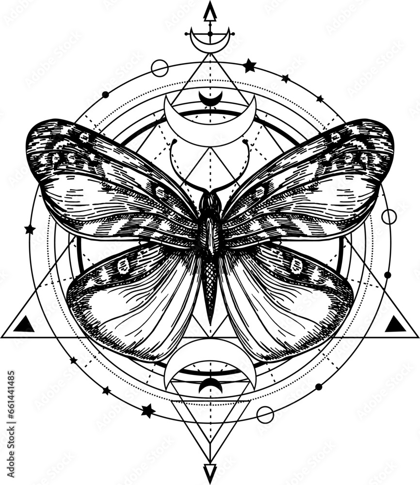 Zwierzęta geometria - Bohemian butterfly tattoos in geometric style. Butterfly illustration sketch, mystical symbol.... #661441485