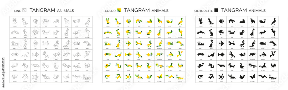 Zwierzęta geometria - Big tangram puzzle set for kids. Tangram animals. Illustrations of lines, colors and silhouettes.... #731320050