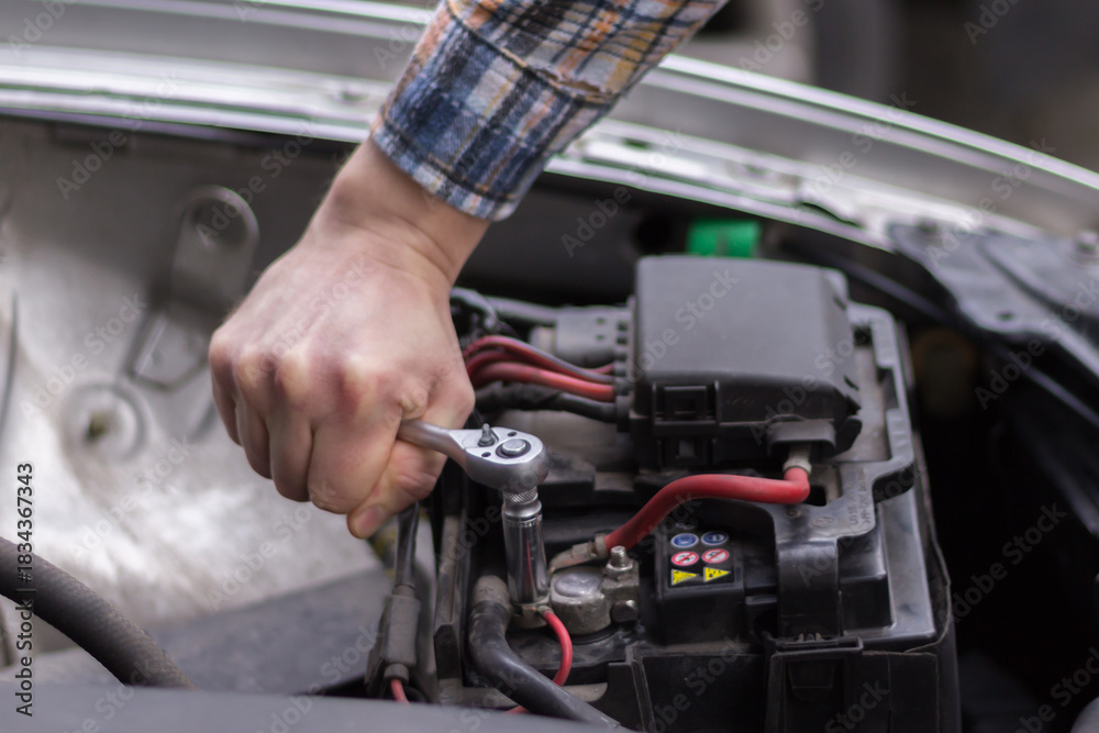 Auta - Naprawa akumulatora samochodowego – męska dłoń dokręcająca klemę kluczem w komorze silnika #1834367343