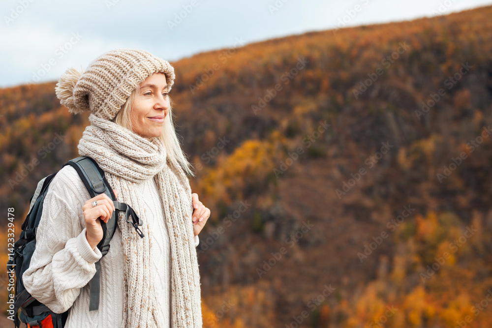 Góry - Middle Aged Woman with backpack walking in the autumn forest trip #1423329478