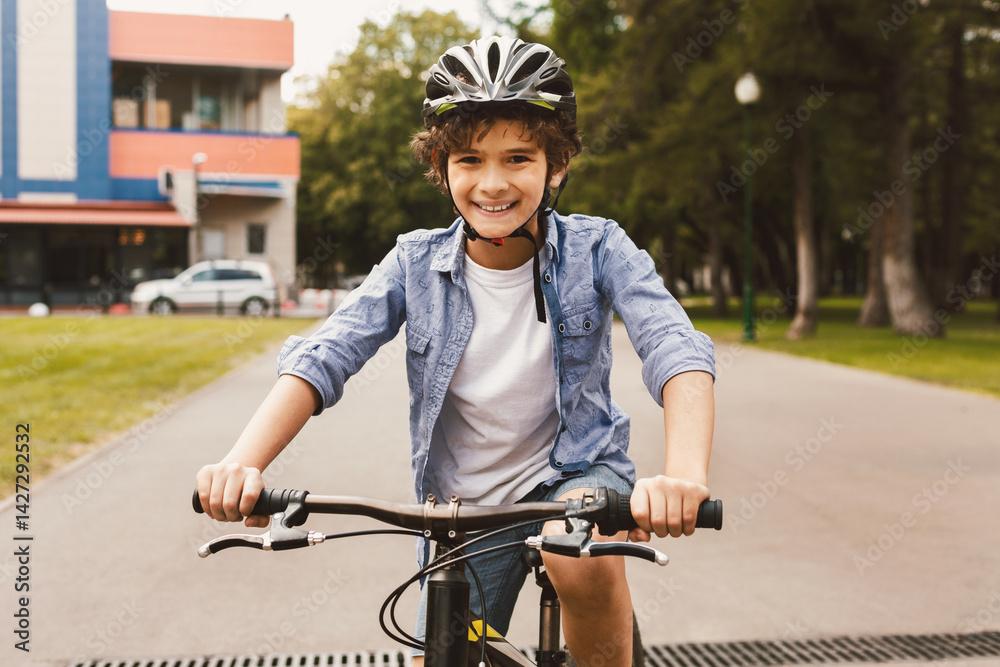 • Summer Activity. Front portrait of cheerful little boy riding a bicycle in public park and smiling, wearing protective safety helmet, posing and looking at camera, blurred background, selective focus