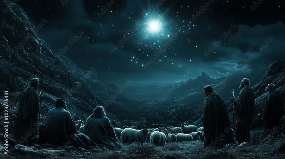 Anioł - Shepherds surprised in their campsite by an extraordinary light from the sky, performing dramatic... #1023776431