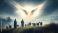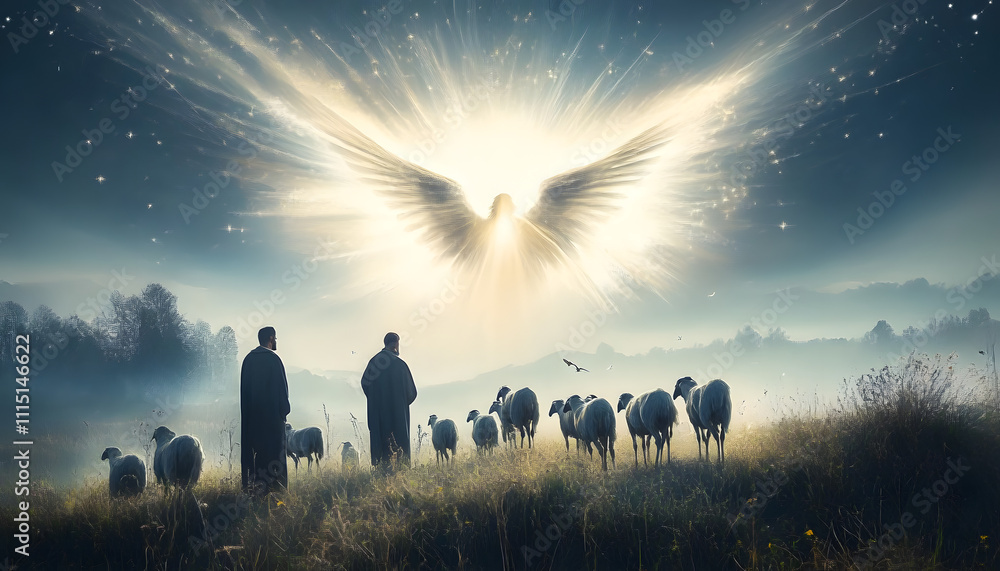 Anioł - Shepherds watching their flock in a field looking at an angel in the sky, emanating light. #1115146622